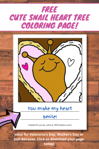 Click the image below to visit our Payhip Shop to pick up an easy 4 click download of this week’s FREE featured coloring page – Cute Snail Heart Tree – a good one to color up for someone you really love a lot. Possible thiings you could write on it include, “Sending you a slow-paced hug and a whole lot of love.”, “My heart is full whenever I’m with you.”, “You make my heart smile.” or “Where there is love there is life.” — Mahatma Gandhi