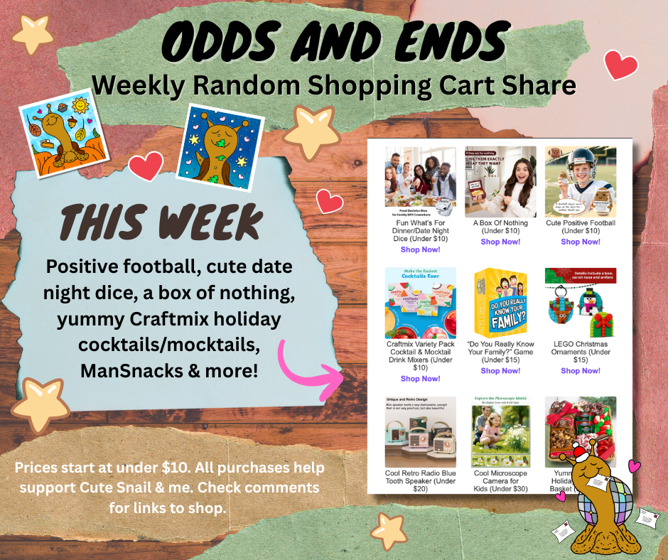 Hi FB and social networking friends! It’s time for another ODDS AND ENDS Weekly random shopping cart share courtesy of Amazon! This week, positive football, cute “date night “What’s For Lunch/Dinner/Date Night dice, a box of nothing, yummy Craftmix cocktails/mocktails, ManSnacks & more! Prices start at under $10 and don’t exceed $40. All items are in order by price and little blurbs about each product are below the pictures. Ideal for those looking for fun and yummy gifts for family, friends, coworkers or themselves. Until next time! Enjoy a SNAIL-TASTIC week! Thanks for your business and kind support 🍁✨👻🎃🌱🌻🐌