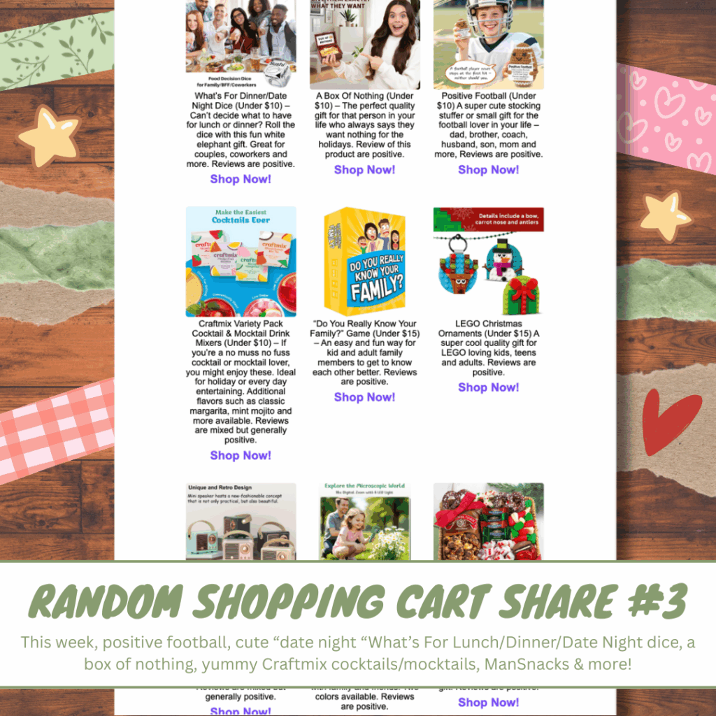 Hi FB and other friends! It’s time for another ODDS AND ENDS Weekly random shopping cart share courtesy of Amazon! This week, positive football, cute “date night “What’s For Lunch/Dinner/Date Night dice, a box of nothing, yummy Craftmix cocktails/mocktails, ManSnacks & more! Prices start at under $10 and don’t exceed $40. All items are in order by price. Ideal for those looking for fun and yummy gifts for family, friends or themselves. Until next time! Enjoy a SNAIL-TASTIC week! 🍁✨👻🎃🌱🌻🐌