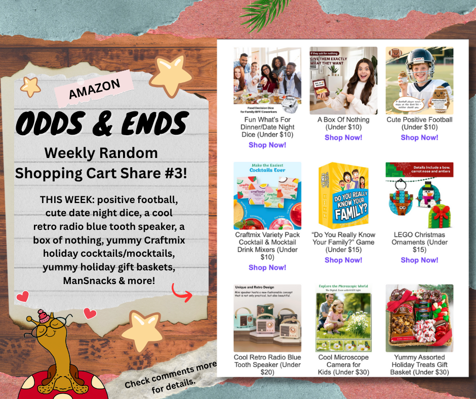 Hi random shopping find loving friends! It’s time for another ODDS AND ENDS Weekly random shopping cart share courtesy of Amazon! Prices start at under $10 and don’t exceed $40. All items are in order by price and notes about each product are located below the pictures. This week, positive football, cute “date night “What’s For Lunch/Dinner/Date Night dice, a box of nothing, yummy Craftmix cocktails/mocktails, ManSnacks & more! Ideal for friends, family, coworkers and other loved ones who appreciate sweet, fun and thoughtful gifts. All proceeds go towards Amazon gift cards for myself, my family and Cute Snail of course. Thank you for your business and kind support. Until next time! Enjoy a SNAIL-TASTIC week!