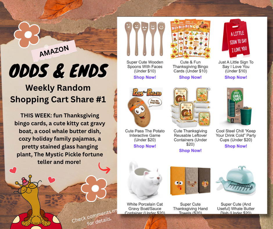 Hi random shopping find loving friends! It’s time for another ODDS AND ENDS Weekly random shopping cart share courtesy of Amazon! Prices start at under $10 and don’t exceed $30. All items are in order by price and notes about each product are located below the pictures. This week, fun Thanksgiving bingo cards, a cute kitty cat gravy boat, a cool whale butter dish, cozy holiday family pajamas, a pretty stained glass hanging plant, The Mystic Pickle fortune teller and more! Ideal for family, friends and other loved ones who appreciate sweet, fun and thoughtful gifts. All proceeds go towards Amazon gift cards for myself, my family and Cute Snail of course. Thank you for your business and kind support.  Until next time! Enjoy a SNAIL-TASTIC week!